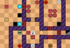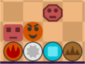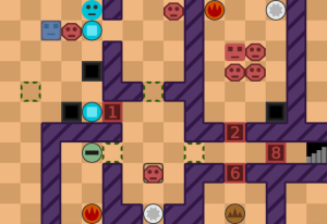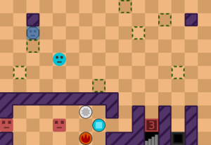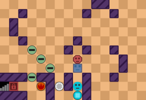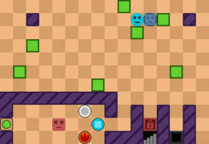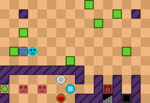 - レベル24:まずは上の部屋の8角形を下に運んでボタンを押さえて、敵を火で倒そう■ヒント図■。左上の部屋の穴を使って3体倒そう(1体は残ってOK)■ヒント図■。右上の部屋の敵を全滅させて、土で残りの敵を倒そう。